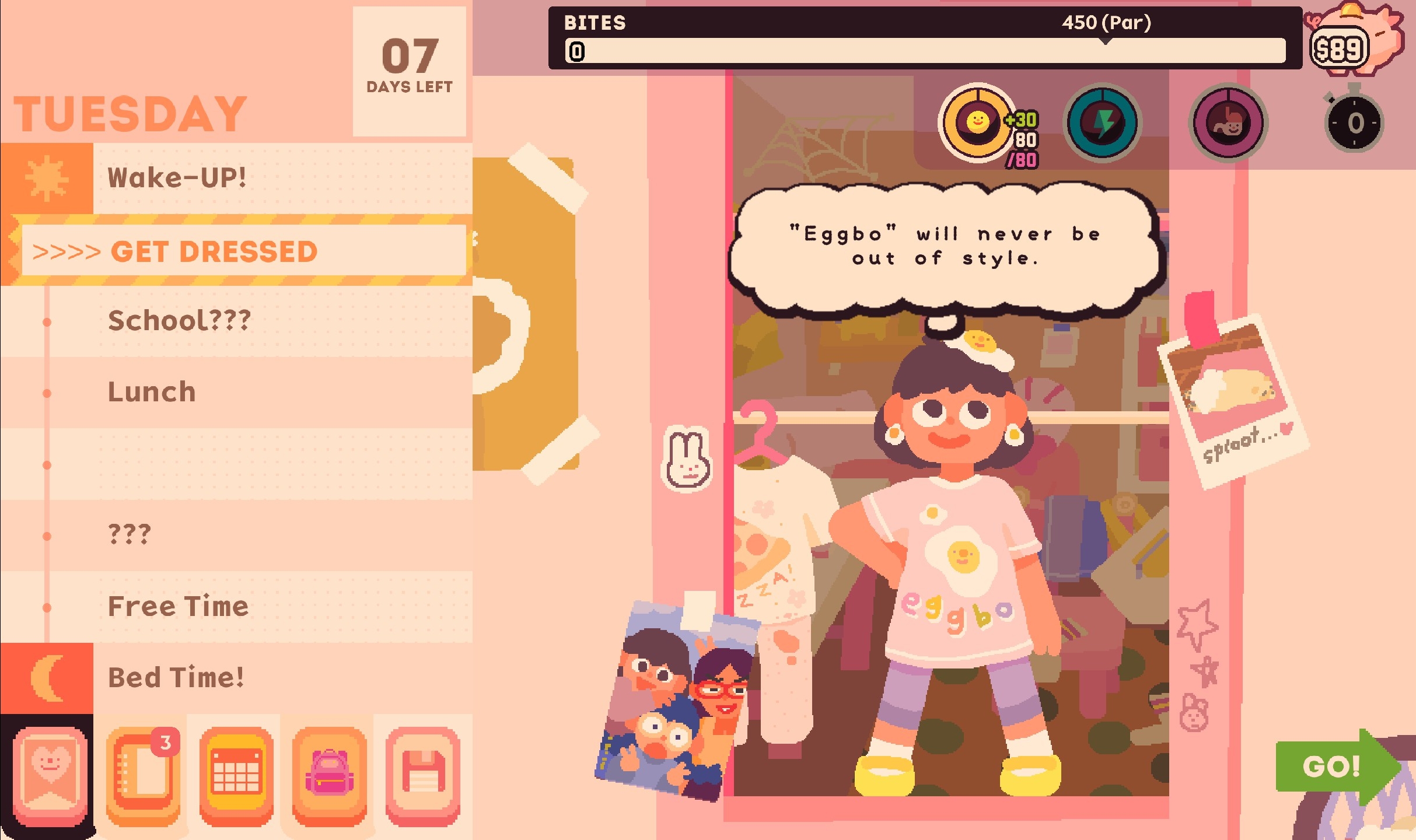 I find that a lot of autobiographical games like this tend to mostly focus on telling the author’s story and are light on actual game mechanics. Consume Me is a notable exception here; practically every action in the game is associated with a WarioWare-esque minigame, whether that be folding the laundry, putting together a healthy lunch, walking the dog, or trying to keep Jenny’s wandering eyes on her assigned summer reading. All of that is assembled within the framework of a daily schedule in which you’re tasked with putting the right strings of actions together in order to balance Jenny’s energy, happiness, and hunger with getting all of her weekly tasks done. It throws some serious curveballs at you, especially in later chapters. Part of Chapter 5 seemed literally impossible at first, but the game subtly nudged me toward the power of unhealthy amounts of caffiene and extraordinarily late nights as a way of gaining near-infinite actions at the expense of Jenny’s overall health and happiness. It’s ludonarrative harmony at its best, where the mechanics reinforce the core themes of the narrative, and overall is a superb balancing act by the developers. It’s a great time, and it comes highly recommended from me.